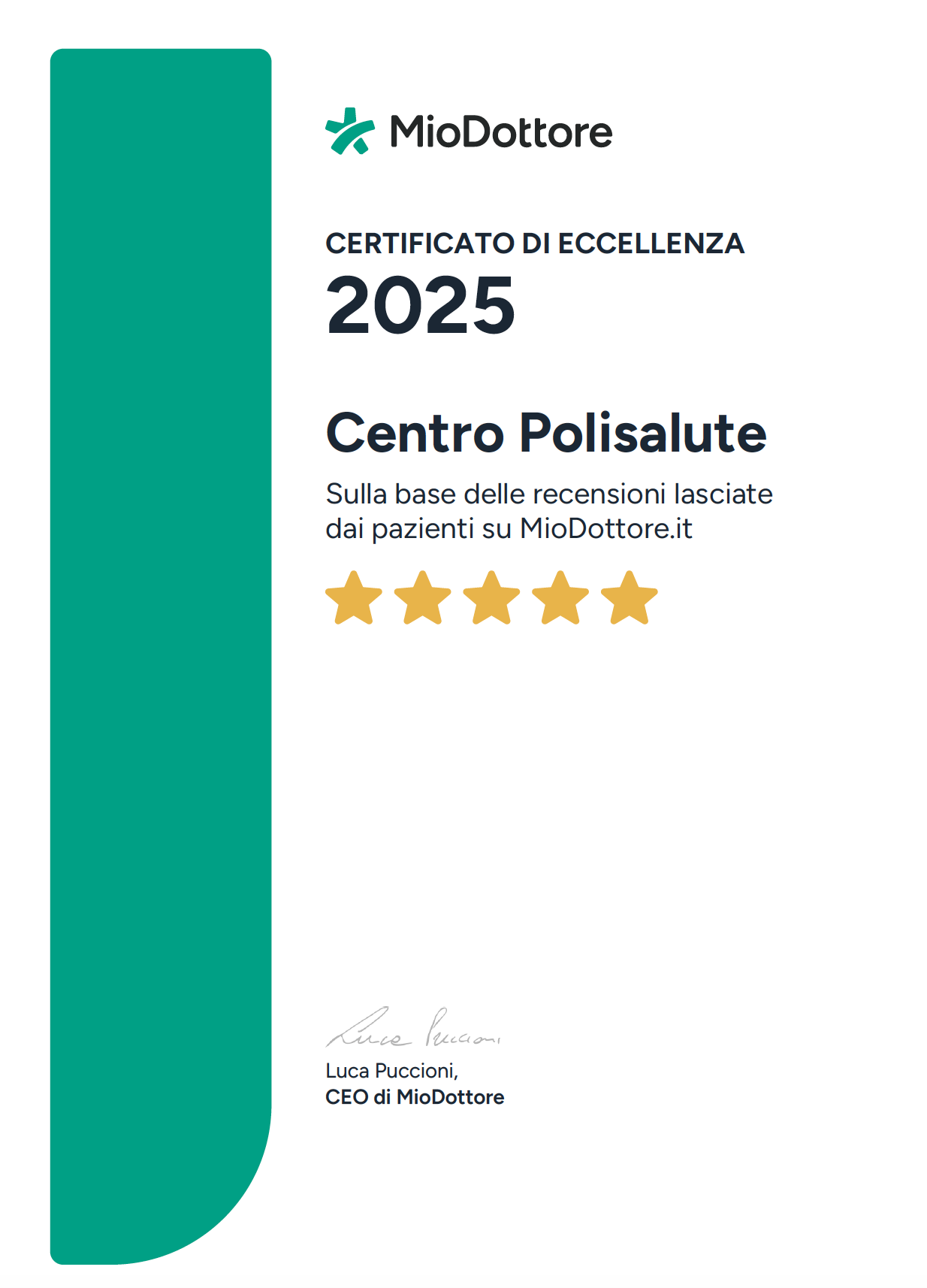 Anche nel 2025 il Centro Polisalute riceve il certificato di eccellenza su MioDottore.it, la piattaforma leader in Italia per la ricerca e la prenotazione online di visite mediche con recensioni verificate da pazienti reali.